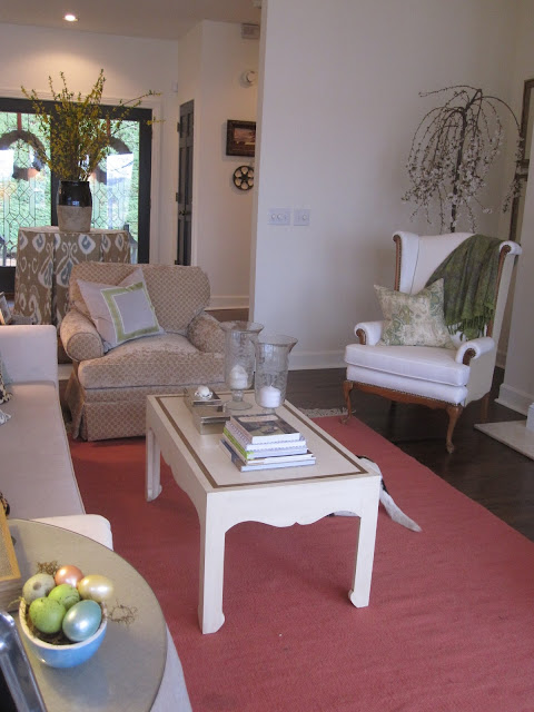 In the entry, the octagonal ikat table now pops with the cow hide underneath. James tucked an arm’s bunch of forsythia into my Mama Doris’ butter churn to welcome guests into the front door!